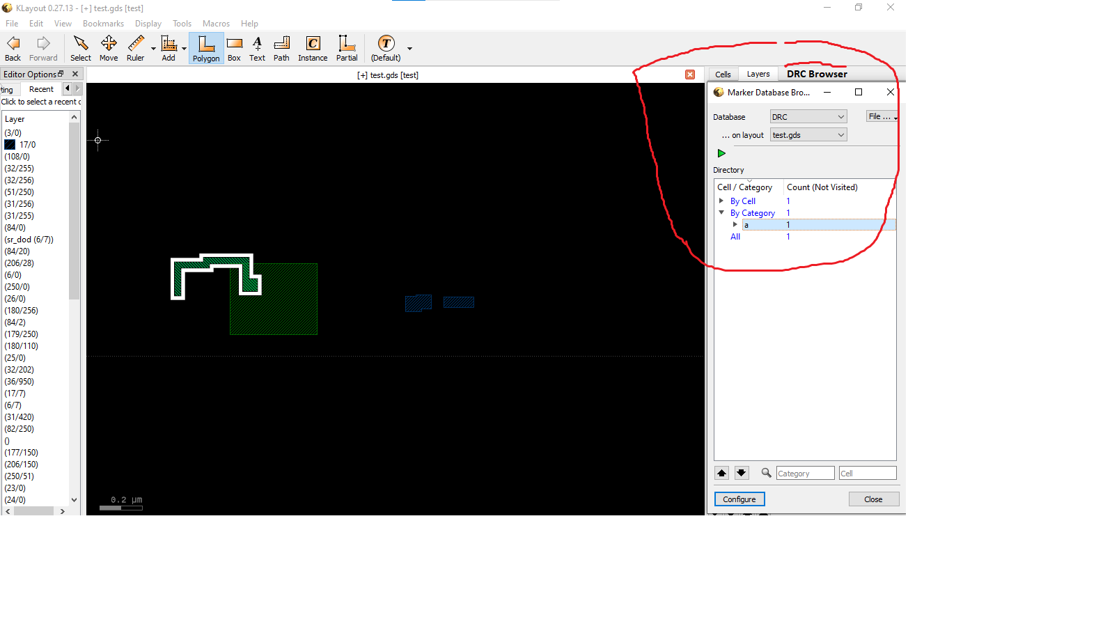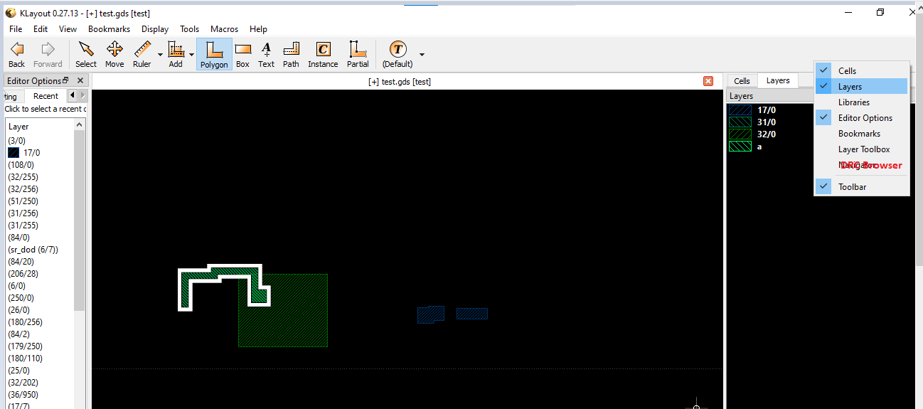 How can I hide the "Editor option" Box in KLayout when I already have it and use the "layer tab" on the right to select a layer to create a new polygon or erase it?