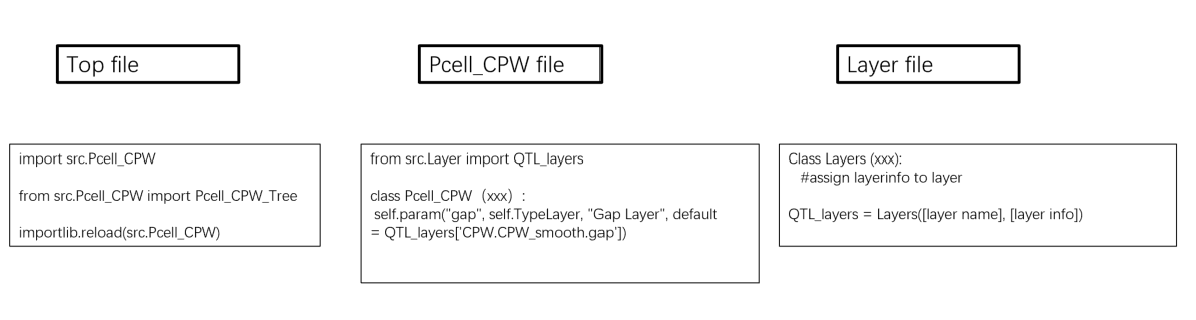 Top file as a pcells library import each pcell module. In each pcell module, I import the layer module and define each pcell class. In the class code, I use param method to define the default layer. In the layer module, I define a class Layer and create a method QTL_layers.
