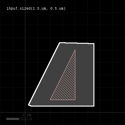 Merged semantics applies, i.e. polygons will be merged before the sizing is applied unless the layer was put into raw mode (see raw). On output, the polygons are not merged immediately, so it is possible to detect overlapping regions after a positive sizing using raw and merged with an overlap count, for example: layer.sized(300.nm).raw.merged(2) Bias values can be given as floating-point values (in micron) or integer values (in database units). To explicitly specify the unit, use the unit denominators. size is working like sized but modifies the layer it is called on. The following images show the effect of various forms of the "sized" method:
