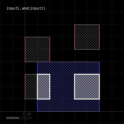 The method computes a boolean AND between self and other. It is an alias for the "&" operator. This method is available for polygon and edge layers. If the first operand is an edge layer and the second is an edge layer, the result will be the edges of the first operand which are inside or on the borders of the polygons of the second operand. The following images show the effect of the "and" method on polygons and egdes (layer1: red, layer2: blue):