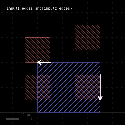 This method selects all shapes or regions from self which touch or overlap shapes from the other region. If self is in raw mode (see raw), coherent regions are selected from self, otherwise individual shapes are selected. It returns a new layer containing the selected shapes. A version which modifies self is select_interacting. This method is available for polygon and edge layers. Edges can be selected with respect to other edges or polygons. The following image shows the effect of the "interacting" method (input1: red, input2: blue):