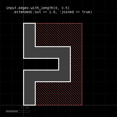 This method applies to edge layers only. Polygons are generated for each edge describing the edge drawn with a certain width extending into the "inside" (the right side when looking from start to end). This method is basically equivalent to the extended method: "extended(0, 0, 0, dist)". A version extending to the outside is extended_out. "extended_out" - Returns polygons describing an area along the edges of the inputUsage: