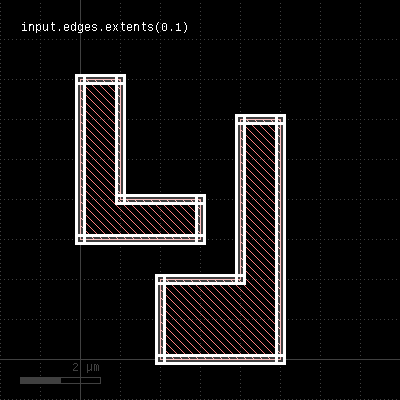This method applies to edge layers only. Polygons are generated for each edge describing the edge drawn with a certain width extending into the "outside" (the left side when looking from start to end). This method is basically equivalent to the extended method: "extended(0, 0, dist, 0)". A version extending to the inside is extended_in. "extents" - Returns the bounding box of each input objectUsage: