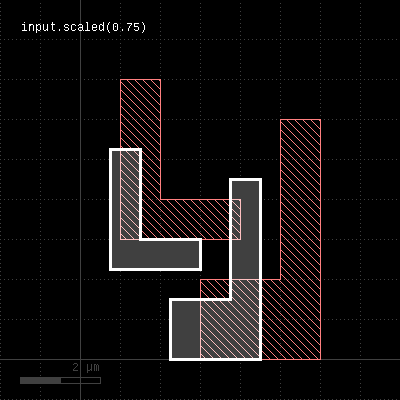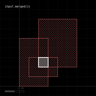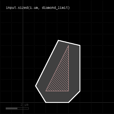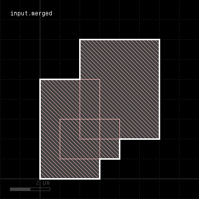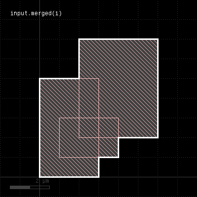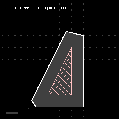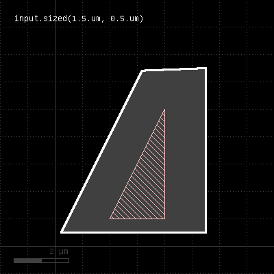 Merged semantics applies, i.e. polygons will be merged before the sizing is applied unless the layer was put into raw mode (see raw). On output, the polygons are not merged immediately, so it is possible to detect overlapping regions after a positive sizing using raw and merged with an overlap count, for example: layer.sized(300.nm).raw.merged(2) Bias values can be given as floating-point values (in micron) or integer values (in database units). To explicitly specify the unit, use the unit denominators. size is working like sized but modifies the layer it is called on. The following images show the effect of various forms of the "sized" method: