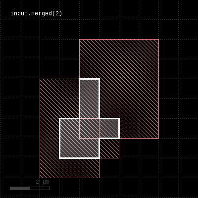 Returns the merged input. Usually, merging is done implicitly using the clean state (which is default). However, in raw state, merging can be enforced by using this method. In addition, this method allows specification of a minimum overlap count, i.e. only where at least the given number of polygons overlap, output is produced. See sized for an application of that. This method works both on edge or polygon layers. Edge merging forms single, continuous edges from coincident and connected individual edges. A version that modifies the input layer is merge. The following images show the effect of various forms of the "merged" method: