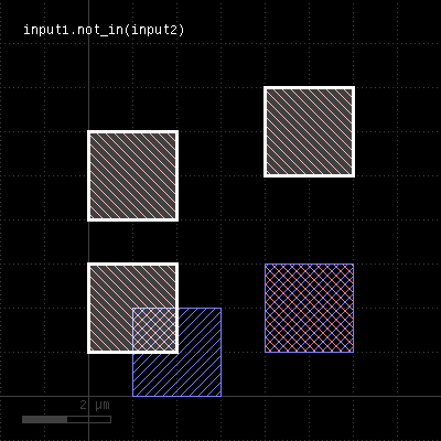 This method selects all shapes or regions from self which are not contained the other region exactly. It will use individual shapes from self or other if the respective region is in raw mode. If not, it will use coherent regions or combined edges from self or other. It will return a new layer containing the selected shapes. A method which selects all shapes contained in the other layer is in. This method is available for polygon and edge layers. The following image shows the effect of the "not_in" method (input1: red, input2: blue):