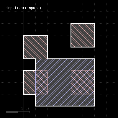 The method includes the edges or polygons from the other layer into this layer. The "+" operator is an alias for the join method. This method is available for polygon, edge and edge pair layers. An alias is "join". See there for a description of the function. "-" - Boolean NOT operationUsage: