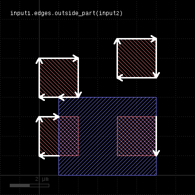 This method returns the parts of the edges which are outside the given region. This is similar to the "&" operator, but this method does not remove edges that are exactly on the boundaries of the polygons of the region. This method is available for edge layers. The argument must be a polygon layer.