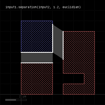 This method performs a two-layer spacing check. Like space, this method can be applied to edge or polygon layers. Locations where edges of the layer are closer than the specified distance to the other layer are reported as edge pair error markers. In contrast to the space and related methods, locations where both layers touch are also reported. More specifically, the case of zero spacing will also trigger an error while for space it will not. As for the other DRC methods, merged semantics applies. The options available are the same than for width. Distance values can be given as floating-point values (in micron) or integer values (in database units). To explicitly specify the unit, use the unit denominators. The following image shows the effect of the separation check (layer1: red, layer2: blue):