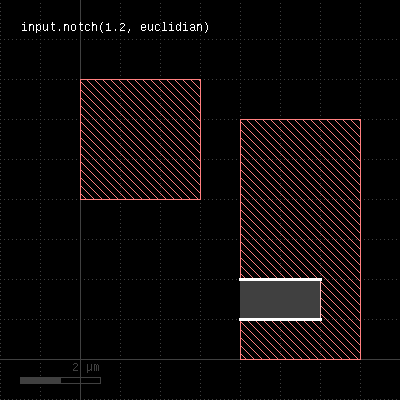 See space for a description of this method. In contrast to space, this method is available for polygon layers only, since only on such layers different polygons can be identified. The following image shows the effect of the notch check:
