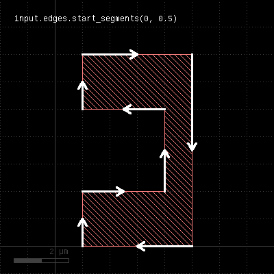 Similar to start_segments and end_segments, this method will return partial edges for each given edge in the input. For the description of the parameters see start_segments or end_segments. The following images show the effect of the method: