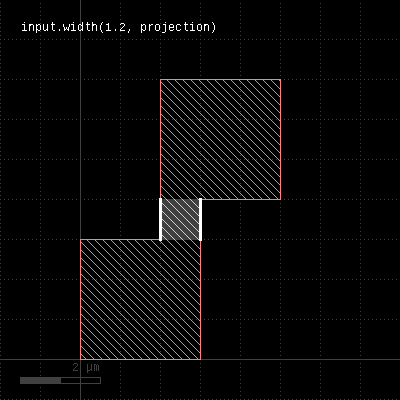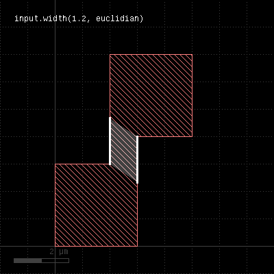 Note that without the angle_limit, acute corners will always be reported, since two connected edges always violate the width in the corner. By adjusting the angle_limit, an acute corner check can be implemented. Merge semantics applies to this method, i.e. disconnected polygons are merged before the width is checked unless "raw" mode is chosen. The resulting edge pairs can be converted to polygons using the polygons method. Distance values can be given as floating-point values (in micron) or integer values (in database units). To explicitly specify the unit, use the unit denominators, i.e. # width check for 1.5 micron: markers = in.width(1.5) # width check for 2 database units: markers = in.width(2) # width check for 2 micron: markers = in.width(2.um) # width check for 20 nanometers: markers = in.width(20.nm) The following images show the effect of various forms of the width check: