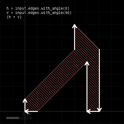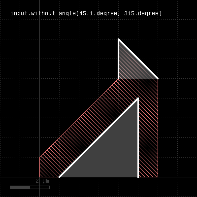 When called on an edge layer, the method selects edges by their angle, measured against the horizontal axis in the mathematical sense. The first version selects edges with a angle larger or equal to min and less than max (but not equal). The second version selects edges with exactly the given angle. The third version is identical to the first one. When called on a polygon layer, this method selects corners which match the given angle or is within the given angle interval. The angle is measured between the edges forming the corner. For each corner, an edge pair containing the edges forming in the angle is returned. A method delivering all objects not matching the angle criterion is without_angle. The following images demonstrate some use cases of with_angle and without_angle: