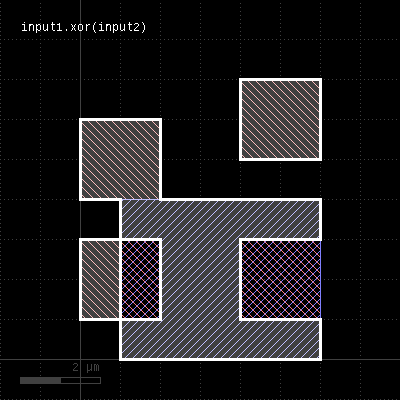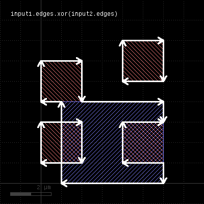 The method computes a boolean XOR between self and other. It is an alias for the "^" operator. This method is available for polygon and edge layers. The following images show the effect of the "xor" method on polygons and egdes (layer1: red, layer2: blue):