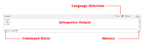 Finally the console panel allows interactive executing of Ruby or Python expressions. The following image shows the console elements and their function: