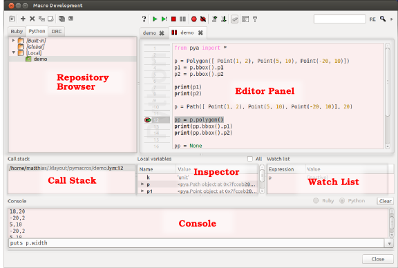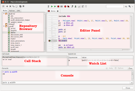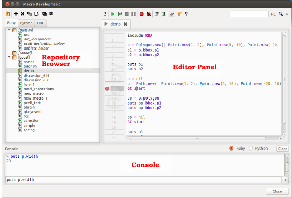 Other files can be stored inside the folders (for example Qt ".ui" files), but they won't be shown in the IDE. The macro development IDEThe macro development IDE consists of three parts: the repository browser, the editor panel and the console. The repository browser allows browsing of the macro repositories and to add new files, to move files, to delete files, to import plain ruby files as KLayout macros and to rename files. In the editor panel, the macro or other files can be edited, breakpoints can be set and the macro can be run. In the console, Ruby expressions can be entered and evaluated. This also works while KLayout is in a breakpoint. That feature evaluating of expressions in the current context and to modify variables. The console also shows the output of the Ruby scripts when they are run in the context of the IDE. The following image shows the IDE with the three main parts: