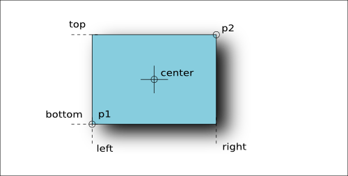 The Box object represents a rectangle whose sides are parallel to the axes. The coordinates are integer values and express the rectangle's dimensions in database units. The basic specification consists of two points, giving the lower left and upper right corner. The constructor takes either two points (which are ordered internally) or four coordinates representing the left, bottom, right and top coordinates. A box has a couple of attributes which are shown in the figure above. The Box#area method delivers the area of the rectangle. A box can be "empty" (non-existing). Such a rectangle can be created by the default constructor without parameters. An empty box basically behaves as a region without a point, i.e. testing the intersection with an empty box always returns false. An empty box returns true on Box#empty?. A box whose lower left point is identical to the upper right one contains just a single point. Such a box returns true on Box#is_point?. A box supports a couple of operations: