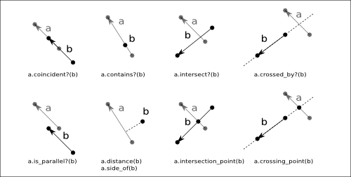 As points, vectors have an x and a y component which can be accessed with Vector#x and Vector#y. Vectors offer two functions to compute the vector product (Vector#vprod) and the scalar product (Vector#sprod). For some applications it's sufficient to know the sign of the product. You can get that with Vector#vprod_sign and Vector#sprod_sign respectively. Vectors don't transform the same way than points. On transformation, only rotation, mirror and scaling (if applicable) is applied. Displacement is not applied. This way, the following two forms are equivalent: (p1 - p2).transformed(t) == p1.transformed(t) - p2.transformed(t) The Box class
