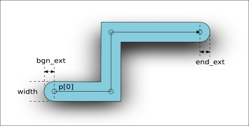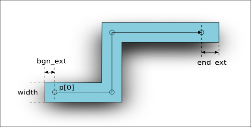 A Path object represents a line with a certain width. The figure above depicts the basic properties of a path. The basic geometry of a path is defined by it's spine - a sequence of points that the path follows. By default, a path has rectangular end caps with variable length. The end caps can be round, in which case the extension should be half the path width to avoid paths which are not compatible with the GDS2 format. Round-ended paths return true on Path#is_round?. An example for such a path is depicted in the following figure: