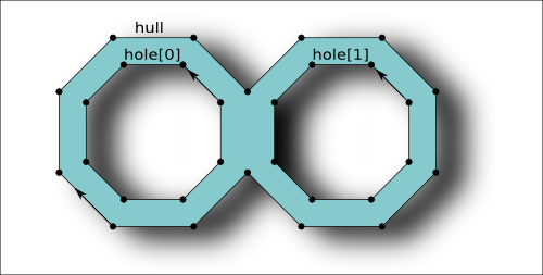 The Polygon object is basically an extension of the SimplePolygon object and in contrast to that object, supports holes. Polygon objects are not compatible with the GDS2 or OASIS format and will be converted to SimplePolygon objects by introducing cutlines when writing them. A polygon consists of an outer contour (the hull) and zero to many hole contours. The outer contour like for the SimplePolygon is oriented clockwise while the hole contours are oriented counterclockwise. This orientation is established internally. For the API, contours are represented by arrays of Point objects. A Polygon differs from a SimplyPolygon by providing methods to modify holes and the hull. Holes can be inserted by using the Polygon#insert_hole method. A hole is identified by an index. The Polygon#holes method returns the number of holes. The hole index runs from 0 to the number of holes minus one. The class method Polygon#from_dpoly creates a integer-coordinate type Polygon object from a floating-point coordinate type DPolygon object (see below). The floating-point coordinates are rounded to the nearest integer coordinates. A constructor is provided that creates a Polygon object from a SimplePolygon object. Polygon#each_edge will deliver all edges. The orientation of the edges determines whether they belong to a hole or the hull contour. Polygon#each_point_hull will iterated over all points of the hull and Polygon#each_point_hole over the points of the hole with the given index. Polygon#num_points_hull will return the number of points for the hull and Polygon#num_points_hole the number of points for the given hole. Polygon#point_hull will return a specific point from the hull and Polygon#point_hole a specific point for the given hole. Polygon#num_points returns the total number of points. Polygon#resolve_holes will remove all holes and connect them with the hull by introducing cutlines that connect the hole with the hull. This operation introduces new vertexes and hence may apply some distortion due to grid snapping. Polygon#resolved_holes returns the polygon with the holes removed without modifying the object it is called on (out-of-place operation). Polygon#to_simple_polygon basically does the same but returns a SimplePolygon object. Using Polygon#assign_hull (or Polygon#hull=) and Polygon#assign_hole the hull contour or a hole contour can be replaced with the given array of Point objects. Please note that it is possible to create invalid polygons where the holes are not completely contained in the hull. Such polygons may not behave as expected. The same is true for polygons with self-intersecting or twisted contours. The Path class