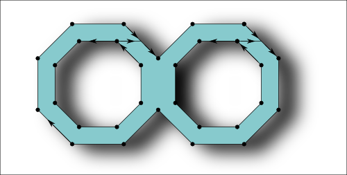 A SimplePolygon object is a polygon that does not have holes. It consists of a single, closed contour. Such polygons are compatible with the GDS2 format for example. A SimplePolygon object can be created from a Box object or from an array of Point objects. Internally, the points will be ordered into a clockwise orientation. The class method SimplePolygon#from_dpoly creates a integer-coordinate type SimplePolygon object from a floating-point coordinate type DSimplePolygon object (see below). The floating-point coordinates are rounded to the nearest integer coordinates. The SimplePolygon#bbox method returns the bounding box of the polyon. SimplePolygon#area will return the area of the polygon. SimplePolygon#num_points returns the number of points, while SimplePolygon#point returns the point for a given index. SimplePolygon#points= replaces the polygon by a new polygon with the given array of points. The SimplePolygon#each_point iterator will deliver each point in clockwise orienation, starting form the bottom/leftmost one. SimplePolygon#each_edge will deliver all edges of the polygon (connecting every point with the next one). SimplePolygon#compress will remove points that connect two collinear edges. It has a parameter that controls whether to remove reflecting edges (spikes) as well. SimplePolygon#inside? returns true, if a given point is inside the polygon. SimplePolygon#minkowsky_sum computes the Minkowsky sum between a polygon and another object in various flavors. SimplePolygon#move will displace the polygon by the distance given by the Point argument. SimplePolygon#moved will return the moved polygon without modifying the polygon it is called on (out-of-place operation). SimplePolygon#transformed will return the transformed polygon, either with a simple or a complex transformation (see the description of the Box object and the section about transformations below for a discussion of transformations). Finally, SimplePolygon#round_corners will apply a corner rounding to a copy of the polygon and return that copy without modifying the polygon. Please note that using the Point-array constructors it is possible to create polygons with self-intersecting or twisted contours. Such polygons may not behave as expected. The Polygon class
