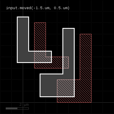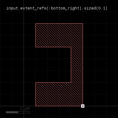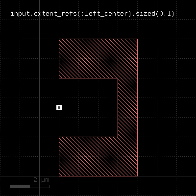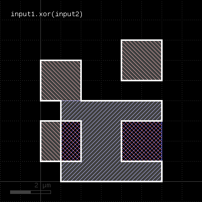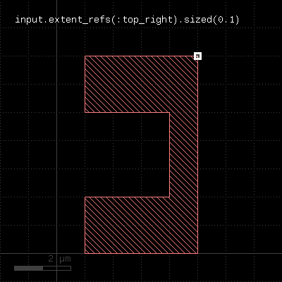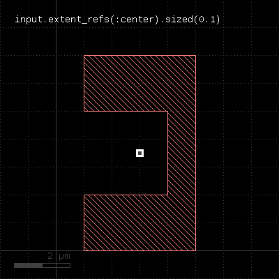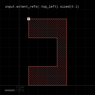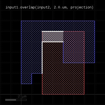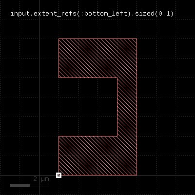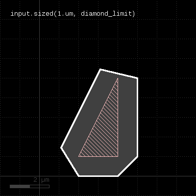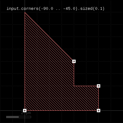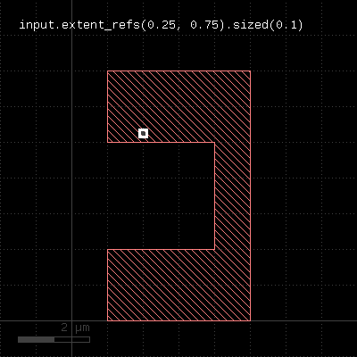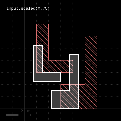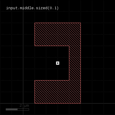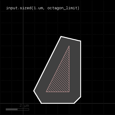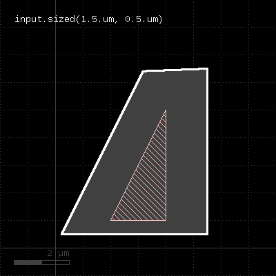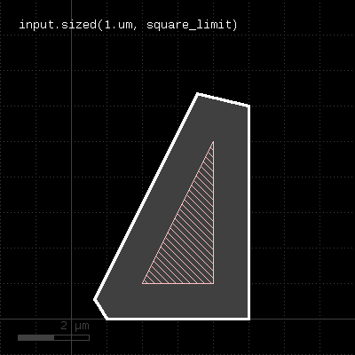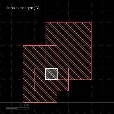 Merged semantics applies, i.e. polygons will be merged before the sizing is applied unless the layer was put into raw mode (see raw). On output, the polygons are not merged immediately, so it is possible to detect overlapping regions after a positive sizing using raw and merged with an overlap count, for example: