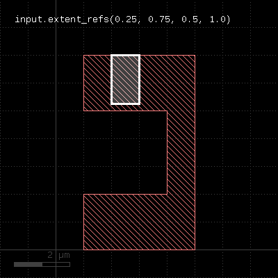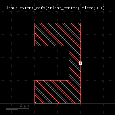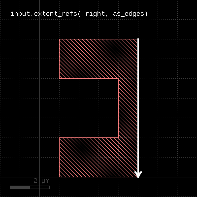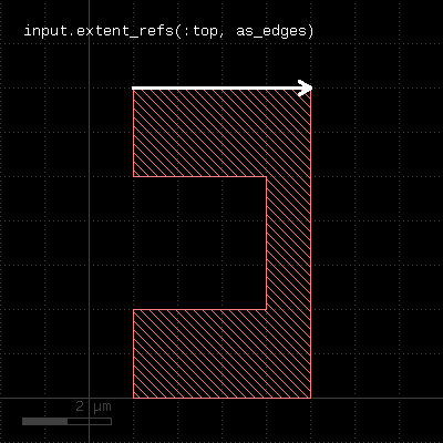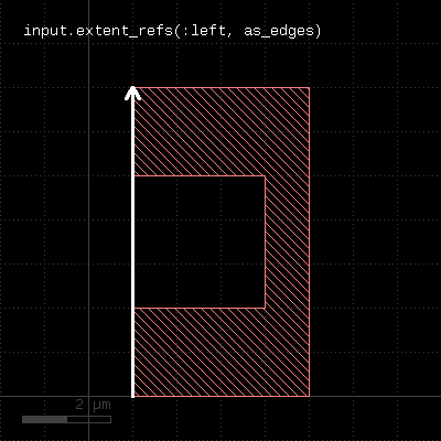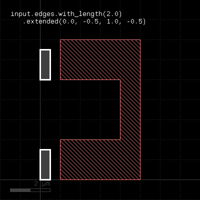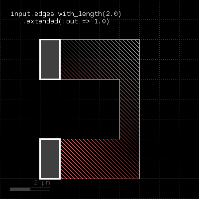 This method applies to edge layers only. Polygons are generated for each edge describing the edge drawn with a certain width extending into the "outside" (the left side when looking from start to end). This method is basically equivalent to the extended method: "extended(0, 0, dist, 0)". A version extending to the inside is extended_in.