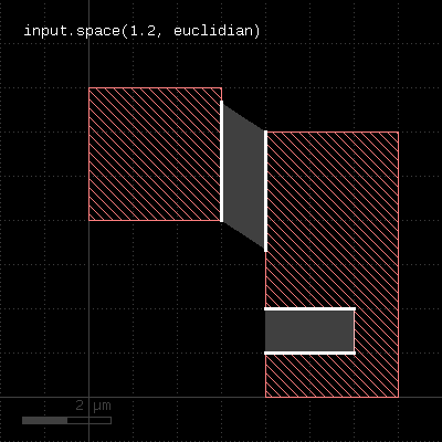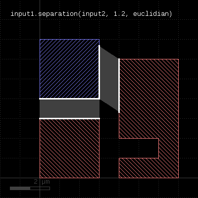 As for the other DRC methods, merged semantics applies. The options available are the same than for width. Distance values can be given as floating-point values (in micron) or integer values (in database units). To explicitly specify the unit, use the unit denominators.