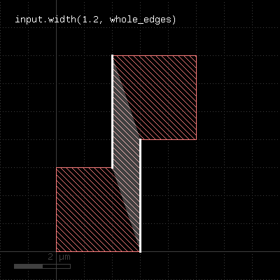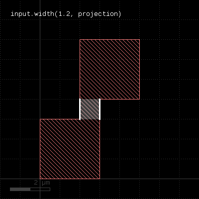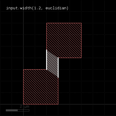 # width check for 1.5 micron: markers = in.width(1.5) # width check for 2 database units: markers = in.width(2) # width check for 2 micron: markers = in.width(2.um) # width check for 20 nanometers: markers = in.width(20.nm)