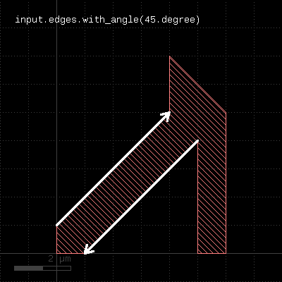 When called on an edge layer, the method selects edges by their angle, measured against the horizontal axis in the mathematical sense. The first version selects edges with a angle larger or equal to min and less than max (but not equal). The second version selects edges with exactly the given angle. The third version is identical to the first one.