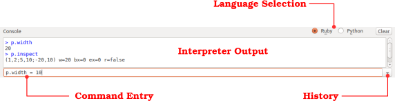 Finally the console panel allows interactive executing of Ruby or Python expressions. The following image shows the console elements and their function: