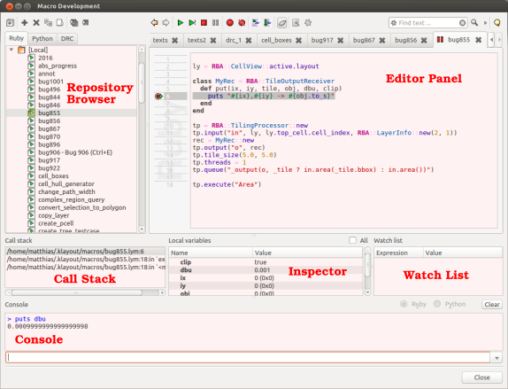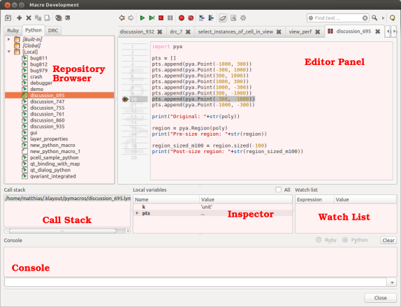 KLayout also offers an integrated development environment (IDE) that allows editing and debugging of Ruby and Python scripts. It offers a simple debugger with the ability to set breakpoints and to interact with the current context while in a breakpoint. An interactive "console" allows entering and evaluating of expressions. This feature is available also when execution has stopped in a breakpoint, so the console can be used to evaluate or modify variables in the current context. Watch expressions are supported as well: a series of expressions can be configured which is evaluated and displayed in a breakpoint. With Python scripts, the local context can be inspected in the "Inspector" window: the variables available in the local context are listed with their values.