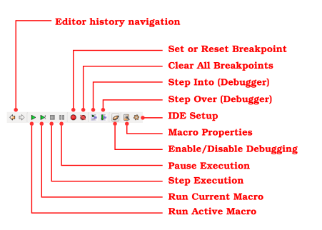 When the macro runs, output will be sent to the console below the editor panel. Breakpoints can be set or reset with the "Set breakpoint" button or the F9 key in the editor panel. Go to the line where you want to change the breakpoint and use "Set breakpoint" to set or reset the breakpoint on the current line. All breakpoints can be cleared with the "Clear all breakpoints" button.