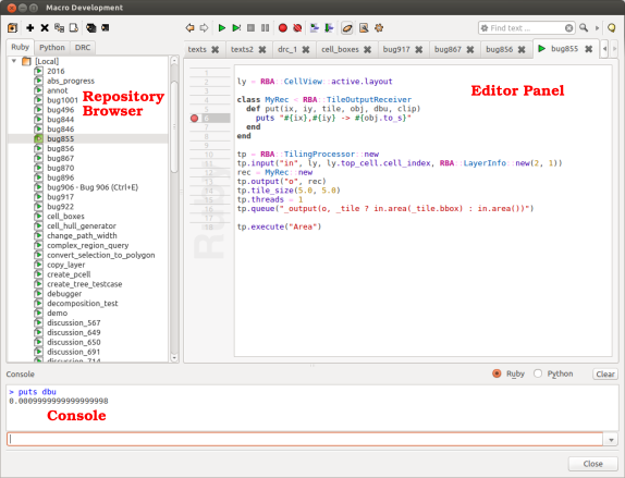 The macro development IDE consists of three parts: the repository browser, the editor panel and the console. The repository browser allows browsing of the macro repositories and to add new files, to move files, to delete files, to import plain ruby files as KLayout macros and to rename files. In the editor panel, the macro or other files can be edited, breakpoints can be set and the macro can be run. In the console, Ruby expressions can be entered and evaluated. This also works while KLayout is in a breakpoint. That feature evaluating of expressions in the current context and to modify variables. The console also shows the output of the Ruby scripts when they are run in the context of the IDE.