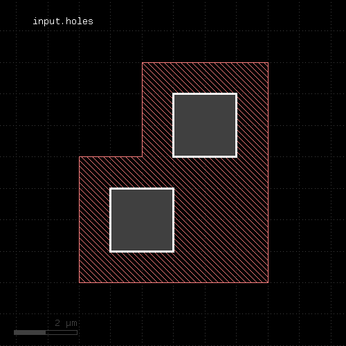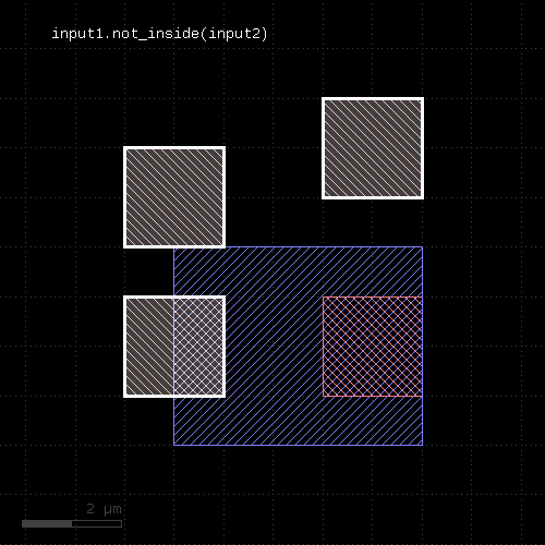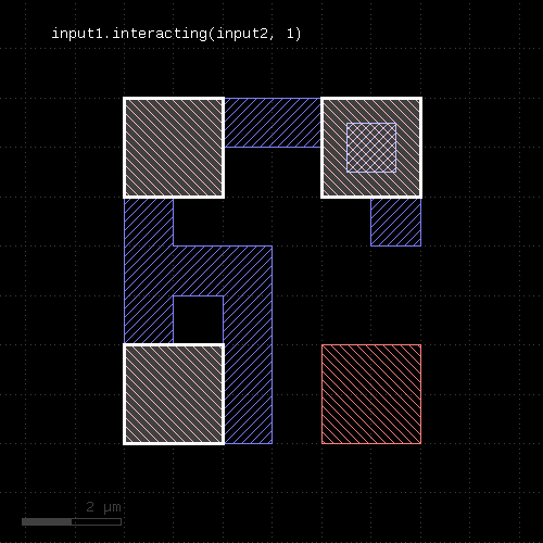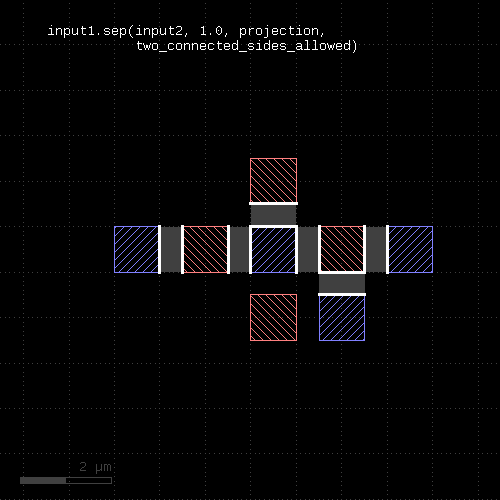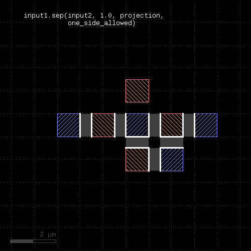 l1 = input(1, 0) l2 = input(2, 0) out = l1.drc(separation(l2) < 0.5.um)