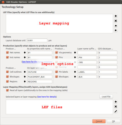You can edit the import settings using the "Options" button from the import dialogs. This will open a dialog for editing the settings attached to the selected technology. The settings basically consist of three parts: the layer mapping, the LEF files which are always read before the LEF files specified per DEF file and various import settings. The following image shows the LEF/DEF import options dialog: