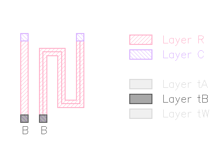 Note: The resistance computation is based on a simple approximation. It computes the number of squares by tracing the perimeter of the "R" polygon. The perimeter length is separated in parts where the perimeter touches the "C" layer and parts where it does not. The number of squares is computed from the non-touching length divided by the touching length.