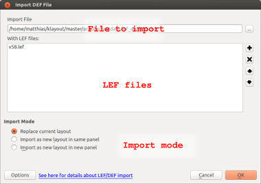 In the import dialog, the files to import are selected. The top edit box specifies the main file to import (the LEF file in the LEF import case or the DEF file in the DEF import case. Use the "..." button to browse for the file. In the DEF import case, additional LEF file can be specified which are imported before the DEF file is read. You can add LEF files to the list using the "+" button and remove the selected LEF files using the "x" button. The order of LEF files matters - the technology LEF file (if there is one) should be read first. The LEF files are read in the order they appear in the list. You can move entries up using the "up" button and down using the "down" button.