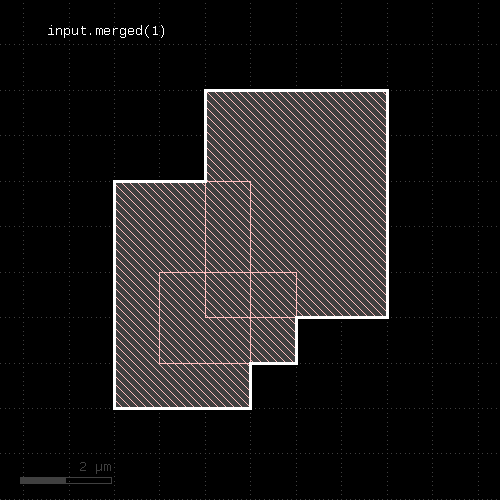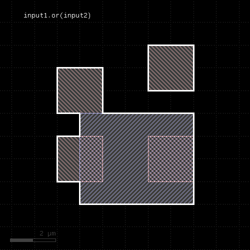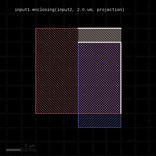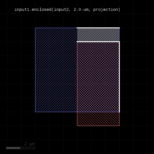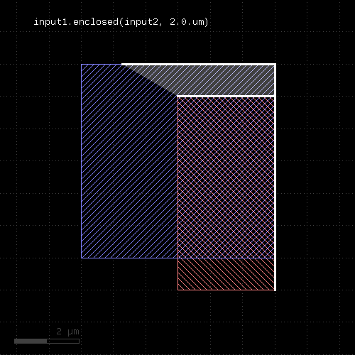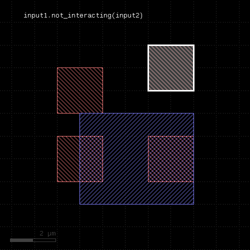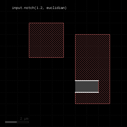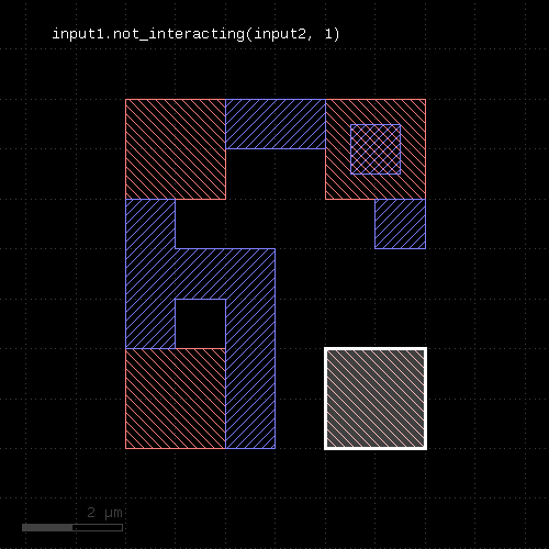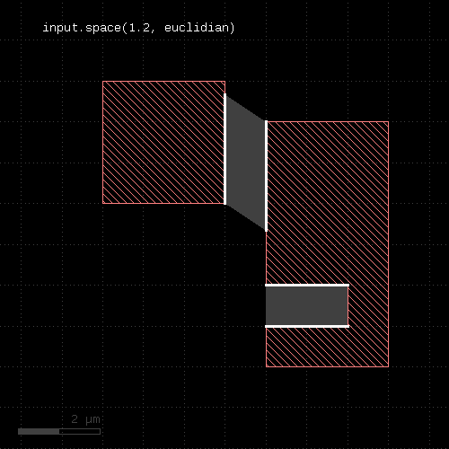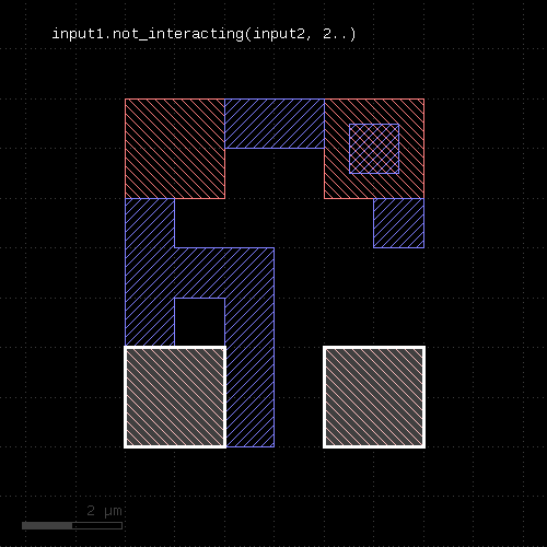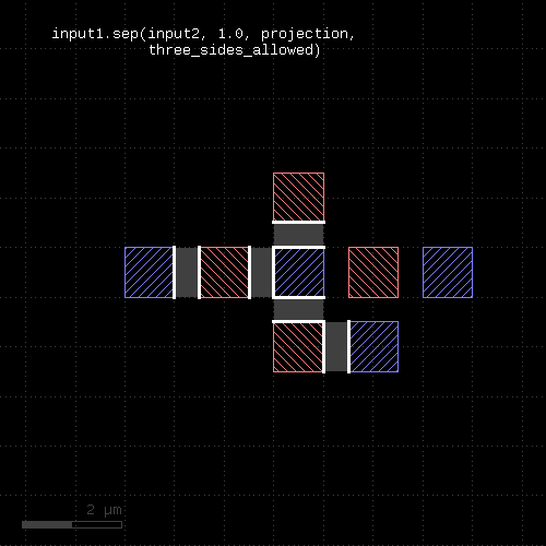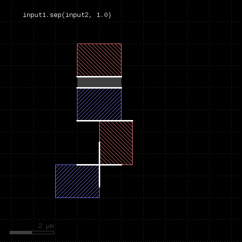 l1 = input(1, 0) l2 = input(2, 0) out = l1.drc(separation(l2) < 0.5.um)