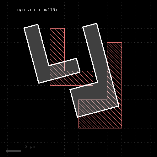 # Rotates by 45 degree t = DCplxTrans(1.0, 45.0, false, DVector::new) new_layer = layer.collect { |polygon| polygon.transformed(t) }