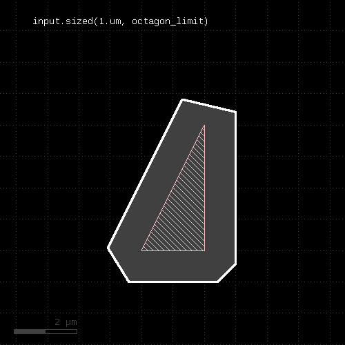 This way, the nature of the "drc" operation is that of the loop over all (merged) input polygons. Within the operation executed on each shape, it's possible to make decisions such as "if the shape has an area larger than something, apply this operation" or similar. This often can be achieved with conventional DRC functions too, but involves potentially complex and heavy operations such as booleans, interact etc. For this reason, the "drc" function may provide a better performance.