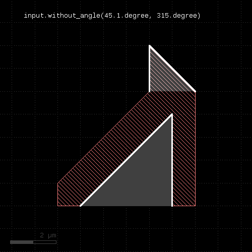 The method basically is the inverse of with_angle. It selects all edges of the edge layer or corners of the polygons which do not have the given angle (second form) or whose angle is not inside the given interval (first and third form) or of the given type (other forms).