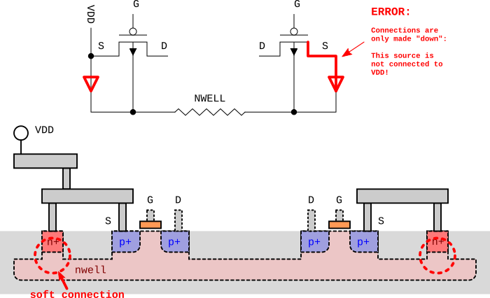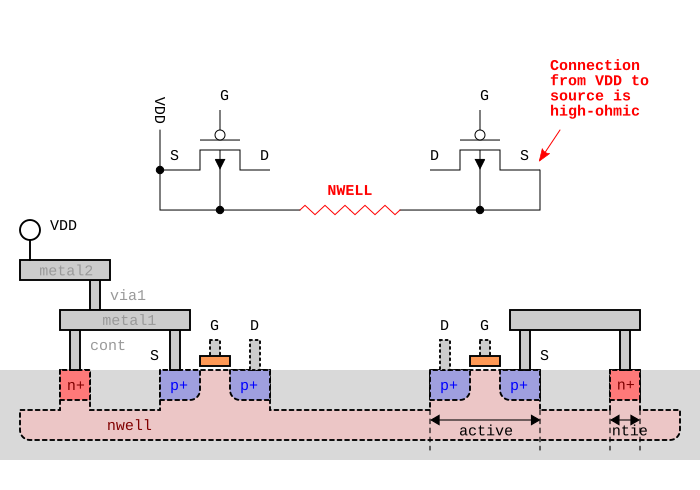 However, there is an issue: As shown in the picture, the left PMOS source is properly connected to VDD. The right one however lacks the metal connection to VDD. From the perspective of pure connectivity, this transistor's source is connected to VDD, but only through a weak n-well connection. Such a device will not work - or at least, badly.