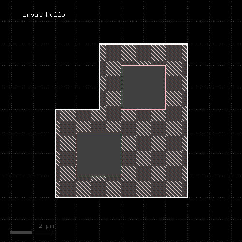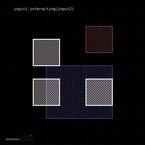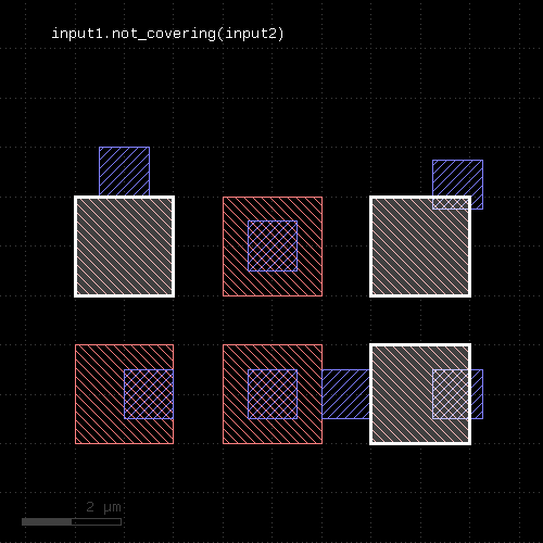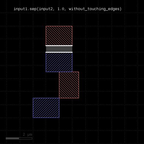 l1 = input(1, 0) l2 = input(2, 0) out = l1.drc(separation(l2) < 0.5.um)