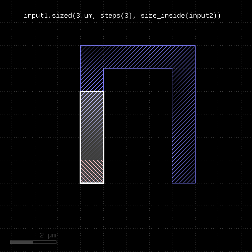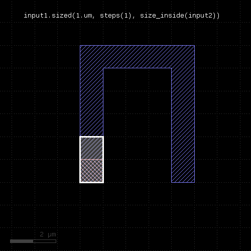 In addition, within the loop a single shape from the input layer is presented to the execution engine which runs the operations. This allows using operations such as "size" without having to consider neighbor polygons growing into the area of the initial shape. In this sense, the "drc" function sees the layer as individual polygons rather than a global "sea of polygons". This enables new applications which are otherwise difficult to implement.