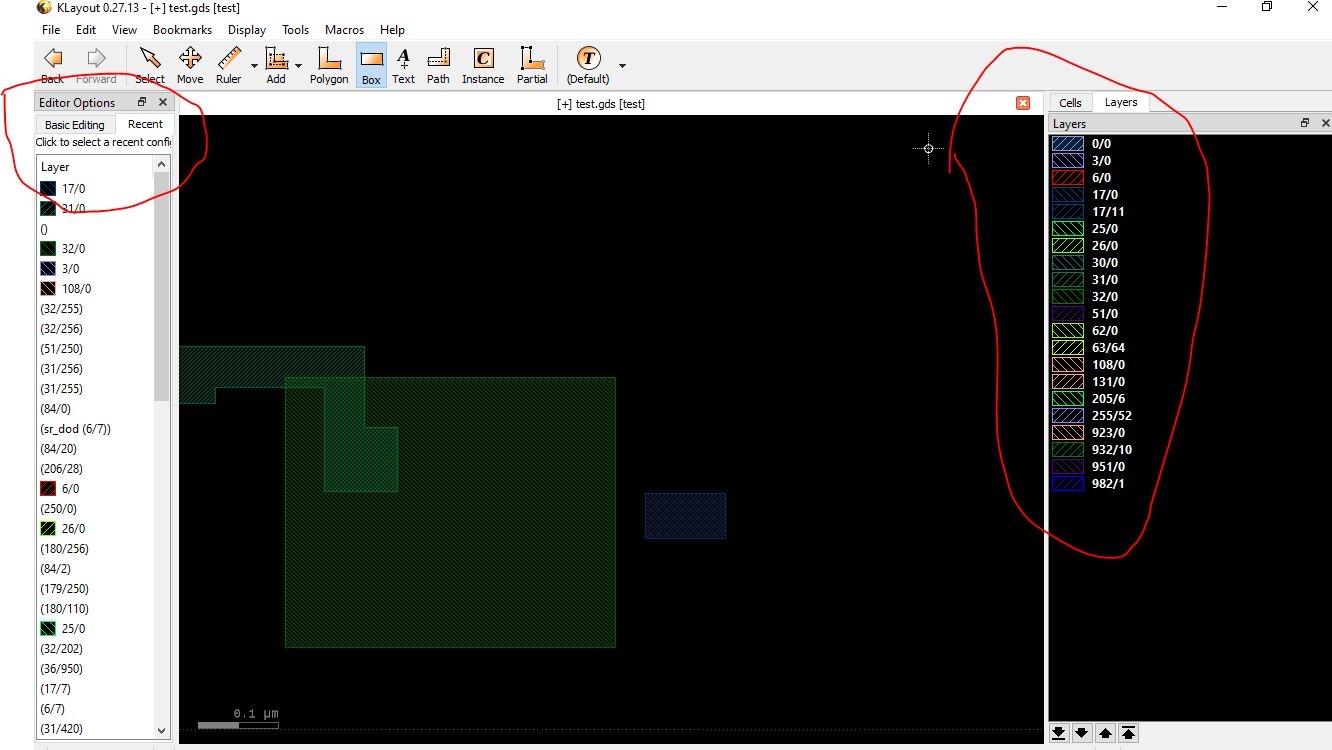 How can I hide the "Editor option" Box in KLayout when I already have it and use the "layer tab" on the right to select a layer to create a new polygon or erase it?
