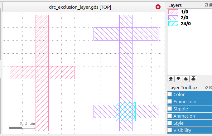 The right purple 'double' cross in the layout are 2 horizontal straights, and these straights overlap with a vertical straight. These 3 straights are in layer 2. When I run the same check again (without using an exclusion layer), I get 2 overlaps (as expected) Call this the 'top-overlap' and the 'bottom-overlap'.