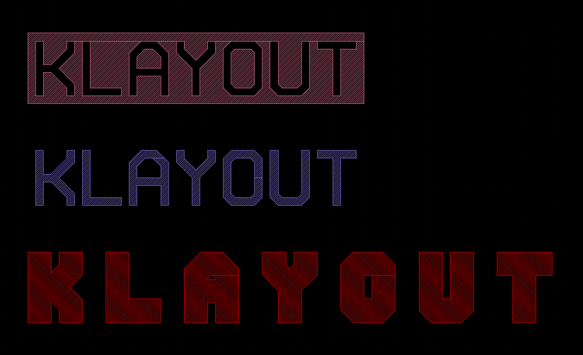 Custom fonts are installed by copying the font file to a folder named "fonts" in one of the places in KLayout's path. The standard font can be found in "src/std_font.gds" in the source package. CIRCLE and ELLIPSEThese PCell's define a circle and an ellipse. In both cases, the number of interpolation points (per full circle) can be specified. The default is 64 points. A circle features a handle to define the diameter. An ellipse features two handles defining the diameters in x and y direction. When a shape is converted to a circle or ellipse PCell, the shape's bounding box will be used to define the enclosing box of the circle or ellipse. DONUTThe donut PCell creates a circle with a hole. This PCell features the same parameters than the circle but an additional parameter defining the hole radius. For that, it provides two handles - one for the outer and one for the inner radius. When a shape is converted to a donut, the shape's bounding box will be used to define the enclosing box of the donut and the hole's diameter will be choosen to be half of the outer diameter. PIE and ARCBoth of these PCell's are segments of circles or donuts. The PIE PCell features two handles to define the radius and start and end angle. The ARC PCell also features two handles to define outer and inner radius as well. The following image shows PIE and ARC in action: