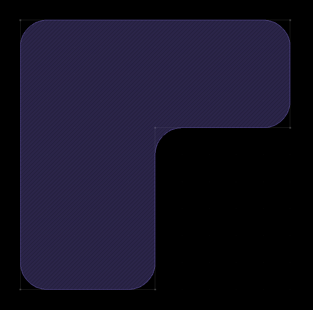 The PCell features a parameter that defines the radius. The path itself can be manipulated as usual, in particular with partial edit mode. Path objects can be converted to ROUND_PATH pcells. In that case, the initial radius will be choosen to be roughly 10 percent of the minimum bounding box dimensions of the original path. ROUND_POLYGONThe round polygon is a PCell that is based on a polygon object but is capable of smoothing the polygon's corners by applying a radius. The following image gives an example: