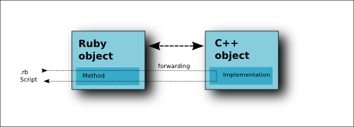 puts box.widthFrom that example we learn that we shall be careful by exposing aggregations through references. The solution is to create a copy from a const reference. The copy then lives in Ruby space and is basically detached from the C++ object. If copying is not an option because the object is too heavy, a bidirectional link will be used in most cases. For example: main_window = ... # the RBA::MainWindow object # returns a reference to a RBA::LayoutView object living in C++ space: view = main_window.current_view # deletes all views and also the object we have a reference to main_window.close_all # this will fail, because the view is a Ruby proxy that knows that the C++ object # has been deleted: view.load_layout(...) Calling "destroy" on an object living in C++ space is not safe in general. In some cases, this can have fatal consequences (i.e. destroying the MainWindow object). An exception from that rule are Qt objects because Qt does lifetime monitoring internally and destroying an object from the outside (Ruby) is a valid operation in most cases (although there are exceptions). Static And Local Methods, AccessStatic C++ methods is simply implemented as class methods while local methods are implemented as instance methods. RBA also supports binding of protected methods. A Ruby class derived from a C++ class exposed to Ruby can call those methods while code outside that class cannot access those methods. Public methods can be called from anywhere. Data types, Arguments and Return valuesRuby and C++ feature different types of data. While in Ruby, a variable is of any type, in C++ a variable has a fixed type. This also is the case for arguments of methods and return values. A C++ method requires an argument to be of a certain type. In addition, C++ features pointers, references and a variety of containers. Therefore a mapping of Ruby types to C++ types is required. The following table summarizes the mapping for the simple types:
